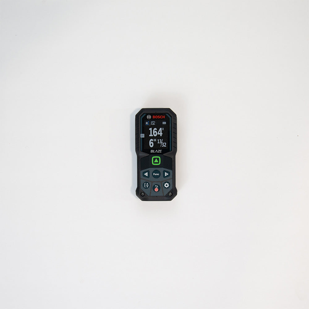 This 165 Ft. green-beam laser measure is a fully featured tool with an easy-to-read color display, great accuracy and reinforced housing for durability. The Bosch BLAZE™ GLM165-25G uses green-beam technology, which generates a point/dot up to 4X brighter than standard red beams.